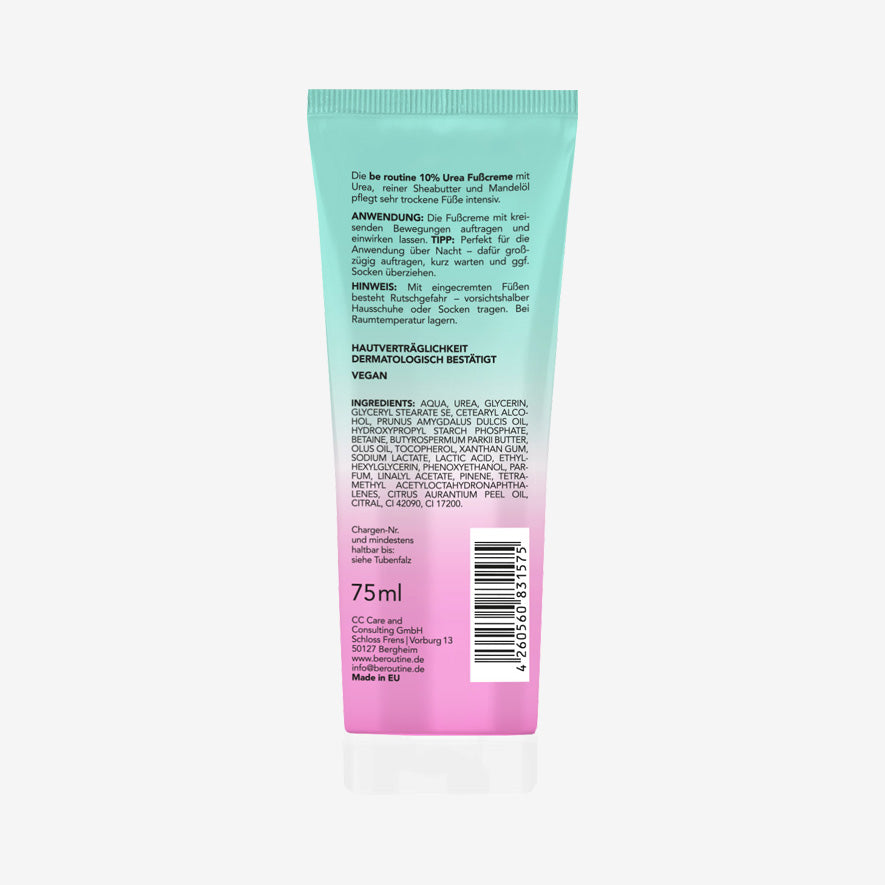 Unsere be routine 10% Urea Fußcreme pflegt deine Füße mit Urea, reiner Sheabutter und Mandelöl. Der zarte Duft bietet ein besonderes Wellness-Erlebnis für schöne, gepflegte Füße.