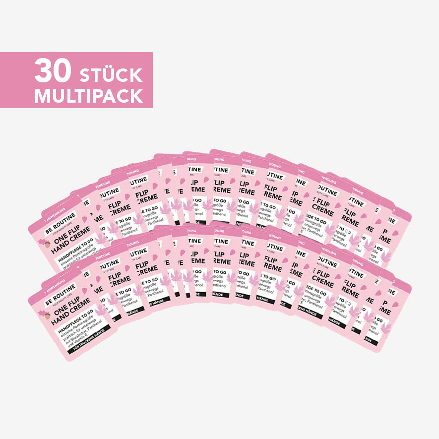 Das BE ROUTINE One Flip Hand Creme-Sparpaket pflegt trockene Hände mit Sheabutter, Panthenol und Vitamin E streichelzart.